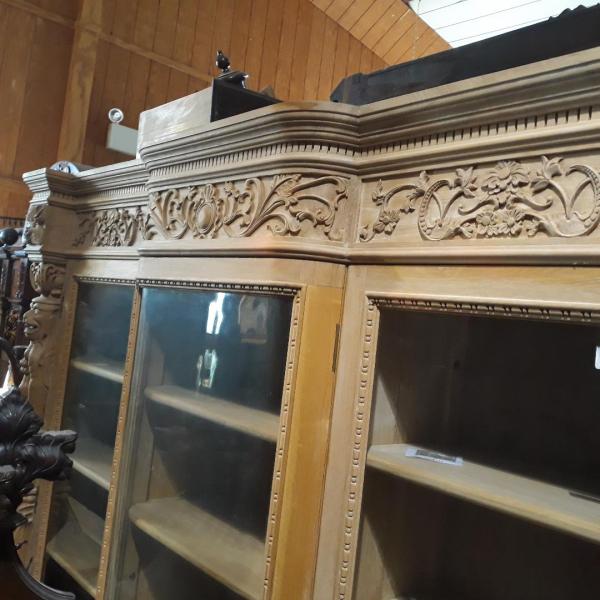 43...Stripped antique carved bookcase . 82 w x 72 1/2" h x 17 deep with curved deeper glass cabinet in the center .......