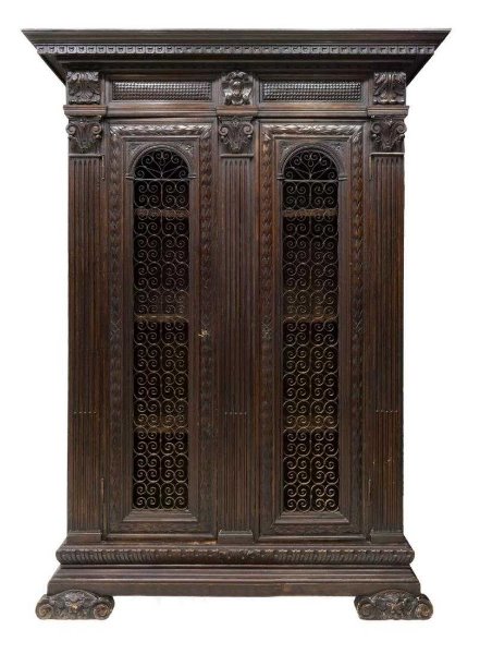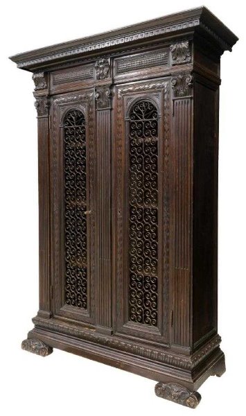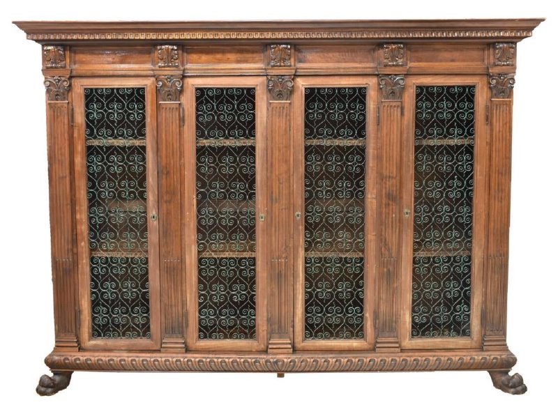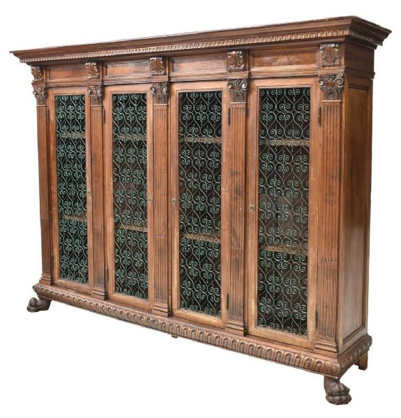 142.....WALNUT BOOKCASE WITH IRON DOOR PANELS...71.75 H X 97 W X 20.5 D